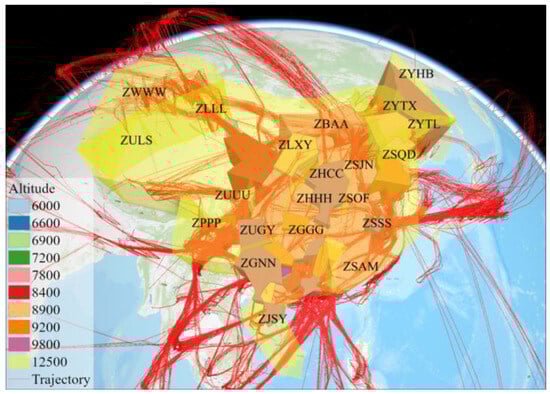 Real-time air traffic trajectories and sector distribution on 5 February 2024 in Chinese national airspace. The red lines represent flight trajectories, while the shaded regions indicate different airspace sectors, with altitude levels denoted by color gradients.