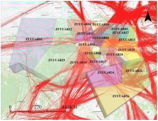 We then retrieved the airspace information dataset from the Aeronautical Information Publication (AIP) provided by the Civil Aviation Administration of China (CAAC), which contains data on 287 sectors in Chinese national airspace. However, due to confidentiality issues, height information is only available for 285 sectors. The dataset includes details on altitude, longitude, and latitude, allowing us to model the airspace using ArcGIS software (v.10.8.2). After inputting the flight trajectories and airspace data, the software generated information on the air traffic situation. As shown in Figure 4, we simulated the complete operational scenario for China on 5 February 2024. The 15,927 trajectories traversed 287 sectors, as visualized in the ArcGIS maps. Figure 5 provides a close-up view, highlighting the large number of trajectories over 27 sectors within the Chengdu Shuangliu International Airport (IATA: CTU, ICAO: ZUUU).