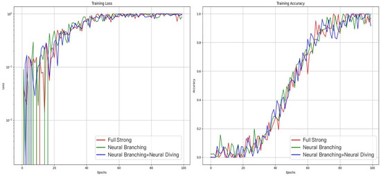 The training results are displayed in Figure 6. The left side of the figure shows the training loss, which measures the gap between the model’s predictions and the actual values during training. Training loss is directly related to the optimization direction and the performance improvement of the model. The green curve represents the neural branching training loss, while the blue curve represents the combined neural branching and neural diving training loss. The trend of these curves is nearly identical: after a brief period of fluctuation, the loss rises sharply, stabilizes, and eventually converges. Both neural networks achieve minimal loss around 60 epochs. The right side of Figure 6 illustrates training accuracy, which refers to the model’s accuracy on the training dataset. The trend of all three curves is similar, with training accuracy stabilizing around 100 epochs. In terms of performance, the results demonstrate that the combination of neural branching and neural diving achieves outstanding training performance.