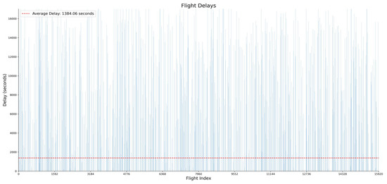 Number of delayed flights and average delay time. The y-axis represents the delay time in seconds, and the x-axis corresponds to individual flight numbers. Each blue bar indicates the delay duration of a specific flight, with a red dashed line marking the average delay of 1386.56 s.