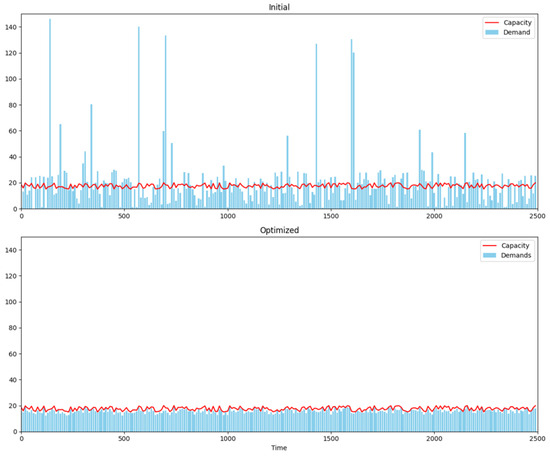 Demand and capacity balancing within NN-DCB. The top graph shows the initial state, where the blue bars represent demand and the red line indicates sector capacity. Significant demand spikes can be observed. The bottom graph illustrates the optimized state, where demand has been adjusted to remain consistently below capacity across all sectors.