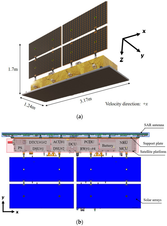 Structural layout of SAR01A: (a) overview of in-orbit status, (b) view from −Y side (PS: propulsion system; DTCU: data transmission control unit; DSU: data storage unit; ACU: antenna control unit; DCU: digital control unit; PCDU: power conditioning and distribution unit; RW: reaction wheel; NRU: navigation receiving unit; MCU: measurement and control unit).