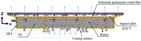 Taking into account the satellite layout and thermal control objectives, we have determined the basic strategy for thermal design. The planned overall heat transfer path of the satellite is illustrated in Figure 2. Let us begin with the antenna’s support plate. The SAR antenna located above the support plate exhibits instantaneous high heat consumption and must adhere to temperature consistency requirements. Consequently, MLI is strategically placed on the Z-side and in the circumferential direction of the antenna, aiming to minimize disturbances from the external environment on that side. (Given that the Z-side of the SAR antenna is larger than the support plate, it is susceptible to the space thermal environment). The heat generated on the antenna is radiated to the space environment through the +Z surface, which is coated with polyimide germanium film and has good wave transmission capability, providing necessary protection for the antenna. Place 20 units of MLI between the support plate and antenna to minimize the impact of the SAR antenna on the temperature control of the support plate. The −Z direction of the support plate is oriented towards the satellite platform. Compared to SAR antennas, the platform offers greater flexibility in arranging heat dissipation surfaces. Through reasonable thermal design, a stable temperature level can be maintained inside the platform. Therefore, an MLI with only 1/4 of the conventional thickness is arranged between the support plate and the platform. By arranging appropriate coating radiators on the +Y side, −Y side, and −Z side of the satellite platform to maintain an average temperature of 20 °C, the required power of the heaters for the support plate can be less. For PS and the battery, their sections are relatively spacious, and the panels are wrapped in MLI, making their thermal control relatively straightforward.
