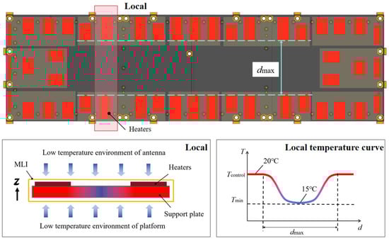 The dimensions of the support plate are 0.78 m × 2.77 m, and it needs to be maintained at 20 °C. A dense arrangement of heaters and thermostats are capable of achieving a temperature control of 20 °C; however, it is not an optimized design and will inevitably result in a waste of satellite resources. The improved method is presented in Figure 3. The connection points between the support plate and the SAR antenna, as well as other panels, are located at its circumferential positions, resulting in significant heat leakage at these locations. Twelve groups of heaters are arranged in the circumferential direction of the support plate, with a controlled temperature of 20 °C, leaving the center area of the support plate blank (without heaters). Assuming that both the antenna and the platform are in a low-temperature state, we take the longitudinal section of the support plate and simplify it into an infinite flat plate model; that is, assuming there is no temperature gradient in the thickness and width directions within the analysis region, it can be regarded as a one-dimensional model with a single-direction temperature gradient. The temperature at a distance of x from the edge of the heater is defined as Tx, so the heat conduction differential equation is expressed as follows [28].