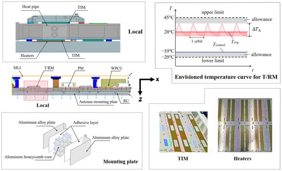 The antenna mounting plate is made of an aluminum skin–aluminum core honeycomb board, ensuring both low weight and high strength, while maintaining excellent planar and longitudinal thermal conductivity. This enables the heat generated by the components to be quickly transferred to the mounting board and dispersed after the imaging process. In addition, when MLI is uniformly arranged in the circumferential direction, the boundary of the antenna mounting plate can be considered as an adiabatic state, and the temperature variation across the entire plane can be regarded as a quasi-static process. Due to the hysteresis effect of heat transfer, T/RMs remain unaffected by the temperature rise of PM during the imaging process. In addition, a double-channel aluminum–ammonia heat pipe is positioned beneath each column of T/RMs, serving to mitigate edge effects and reduce temperature disparities arising from inconsistent heat generation among the T/RMs. Figure 4 shows an overview of the antenna mounting plate.