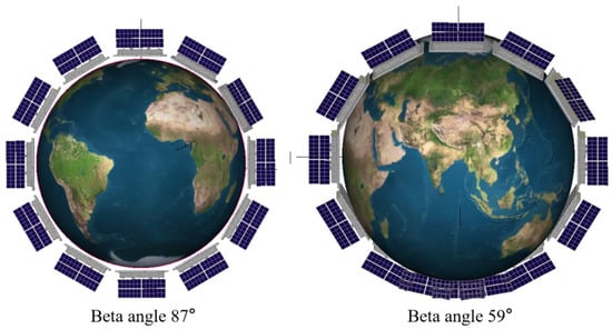 With the rapid advancement of satellite and rocket manufacturing technology, particularly the emergence and application of reusable rockets, the average launch cost of a single satellite has seen a significant reduction, ushering the global aerospace industry into a new era [1,2,3]. A satellite constellation is a system in which multiple satellites work together as a whole, also known as a distributed satellite system (DSS). In DSS, two or more satellites are deployed in the same or multiple orbits to complete specific space tasks through mutual cooperation. Compared to a single satellite, DSS significantly enhances the satellite’s global coverage efficiency, also referred to as temporal resolution [4]. Small- and medium-sized satellites have become the primary components of DSSs, owing to their advantages in terms of lower cost, reduced weight, and shorter development time. LEO is frequently employed as the operational orbit for DSSs, featuring an orbital altitude not exceeding 2000 km. This implies reduced launch costs and offers satellites with high bandwidth and low communication latency. Currently, the scarcity of LEO orbits is intensifying competition among global companies for constellation deployment, leading to a production-centric approach in the design of constellation satellites [5,6].