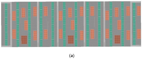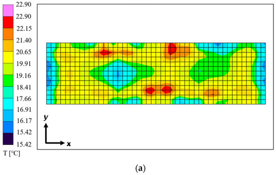 where represents the equivalent heat transfer coefficient of the plate surface, Tout is the ambient temperature outside the support plate, δ signifies the thickness, λ stands for thermal conductivity, ε indicates infrared emissivity, σ represents the Stefan–Boltzmann constant, the subscript u designates the upper surface of the flat plate, while the subscript d designates the lower surface, the subscript p designates the support plate, and T0 represents the temperature of heaters. The boundary conditions of this model can be described as follows.