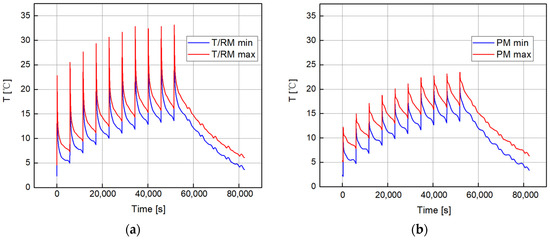 Figure 10 exhibits the temperature curves of 24 T/RMs during the satellite TVAC testing. When comparing the results with Figure 7a, it is observed that under identical thermal conditions as those used in the simulation analysis, the temperature trough of the T/RM is approximately 2 °C higher, while the temperature peak is roughly 4 °C lower. This discrepancy, which arises due to the simplifications made in the simulation analysis, poses no significant impact on the satellite’s operational performance in orbit. During the imaging process, the maximum temperature difference among T/RMs is 3.6 °C, exceeding the simulation analysis results. This discrepancy arises from the fact that the implementation of thermal control measures falls short of the ideal outcomes anticipated during thermal analysis.