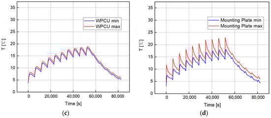 The simulated temperature of the antenna: (a) T/RM, (b) PM, (c) WPCU, and (d) antenna mounting plate.