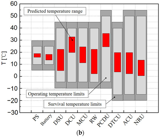 Figure 8a illustrates the temperature distribution of the support plate under low-temperature conditions. The temperature level remains within the design specifications. The lowest temperature point is observed at the center of the structure, reaching a minimum of 15.4 °C, which aligns with the heater layout. Figure 8b illustrates the simulated temperature range of the platform components under extreme operating conditions (represented by the red section), while also presenting the corresponding permissible temperature range (represented by the gray section). Thanks to the reasonable arrangement of heat dissipation surfaces, the temperature of the components inside the platform is maintained at approximately 20 °C. This ensures ample design margin for each device while minimizing the thermal control power required for the support plate. Under extreme high-temperature conditions, the total thermal control power of the support plate is 31.8 W, while under extreme low-temperature conditions, this power increases to 60.2 W, which occupies little power of the satellite to maintain the support plate at 20 °C.