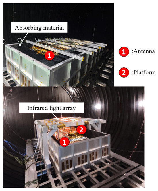 Figure 9 demonstrates the space heat flux simulation method employed for TVAC testing. The SAR antenna is positioned facing a device equipped with absorbing materials, and heaters are affixed to the underside of the device to mimic the space heat flux along the normal direction of the antenna plane (i.e., the satellite’s +Z direction). The thermal test is carried out in a vacuum chamber with controllable temperature, where a high-emissivity black coating is applied to the chamber walls. By adjusting the wall temperature, the chamber can be transformed into a heat flux simulation device [29]. During the thermal testing of the antenna, the heat flux in the Z-direction of the antenna is simulated utilizing this particular approach. During the TVAC testing of the entire satellite, an infrared light array was employed as an additional measure to simulate both the direct solar radiation and the heat flux generated by the solar arrays on the satellite.