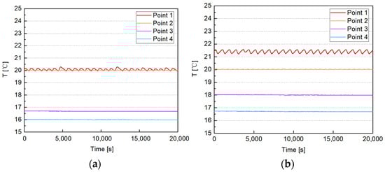Figure 11 illustrates the temperature curve on the support plate during the TVAC testing. Point 1 in the figure represents the temperature measurement point near the DCU and PCDU. Due to the operating components, the temperature of Point 1 is slightly higher than 20 °C under high-temperature conditions. Point 2 denotes the temperature measurement point at other undisturbed positions, while Point 3 and Point 4 are the temperature measurement points at the center of the support plate, which exhibit lower temperatures. Overall, the temperature of the support plate meets the temperature difference requirement of less than 5 °C, and the temperature curve in Figure 11a aligns with the simulated temperature.