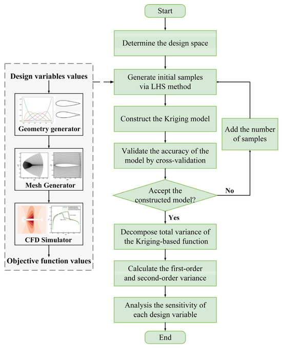 Variable screening methods, particularly sensitivity analysis, represent another key approach to improving optimization efficiency and have been widely applied across various engineering disciplines [21,22,23,24]. Sensitivity analysis, also known as variable importance analysis, identifies input parameters that have a significant impact on outputs while disregarding less influential variables [25]. This process reduces the dimensionality of the design space, decreases problem complexity, and enhances optimization efficiency. Furthermore, by pinpointing and prioritizing key design variables, sensitivity analysis provides essential insights into the interactions between inputs and outputs, which are essential for guiding design decisions and improving the interpretability of complex models. There are many sensitivity analysis methods, including the Morris method, Sobol’s method, and the functional variance analysis method, among others. These methods have been widely applied in various fields to address optimization problems. For instance, Lai et al. [26] applied Sobol’s sensitivity analysis to investigate lithium-ion batteries used in electric vehicles. Jeong et al. [27] proposed an efficient optimization method for aircraft design that analyzed variable sensitivity through functional analysis of variance. Xu et al. [28] introduced an optimization method based on design variable screening. Utilizing a data-driven method that integrates the Kriging regression model with functional analysis of variance, their approach quantitatively assesses the influence of design variables on the objective function and incorporates a screening strategy to reduce both problem dimensionality and computational costs. However, each method has its own strengths and limitations. The Morris method is computationally efficient but cannot capture higher-order effects, while Sobol’s method provides comprehensive sensitivity indices, including first-order and interaction effects. Nevertheless, it relies on multi-dimensional integration and requires a large number of samples to compute sensitivity indices, resulting in high computational costs. To address these challenges, this paper adopts the functional variance analysis method, which improves efficiency by utilizing a Kriging model to transform high-dimensional integrals into one-dimensional integrals.