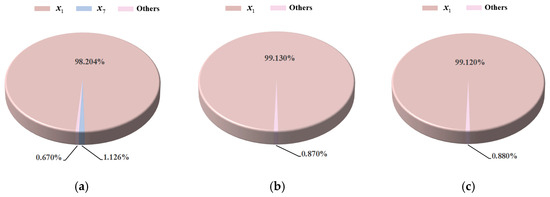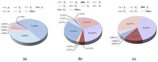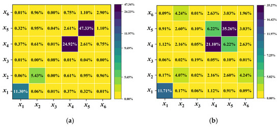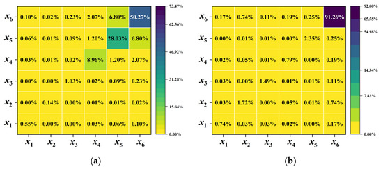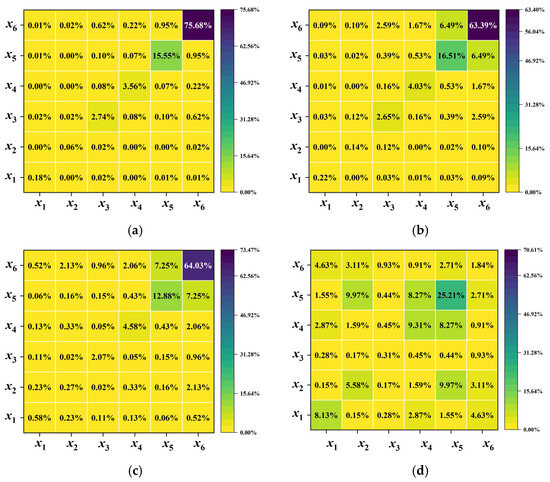 For the combination variation, since the minimum point of and the center position of the initial design space are the same, only the second combination scheme is considered. Table 9 presents the sensitivity analysis results for different combination schemes. It can be observed that as the scaling factor and the translation change, the main effect index of vary. From Combination 1 to Combination 3, the main effect index of increases, while from Combination 4 to Combination 6, the main effect index of decreases.