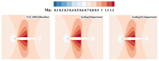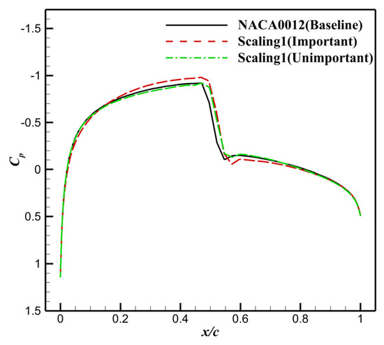 Positive perturbations are applied only to specified variables (an increase in the absolute value of the variable is defined as a positive perturbation), and the perturbation is set to . The other variables remain at their original values. Since the important and unimportant variables is consistent across all three schemes, we chose Scaling 1 for the perturbation analysis. As shown in Table 12. It is evident that, compared to the baseline airfoil, the drag coefficient increases by 52.69% and increases by 10.78% when the important variables are perturbed. In contrast, when the unimportant variables are perturbed, the drag coefficient only increases by 4.30% and increases by 0.87%. Perturbations in the important design variables have a more substantial impact on the drag coefficient, whereas perturbations in the unimportant design variables have negligible effects. This outcome is consistent with sensitivity analysis results.