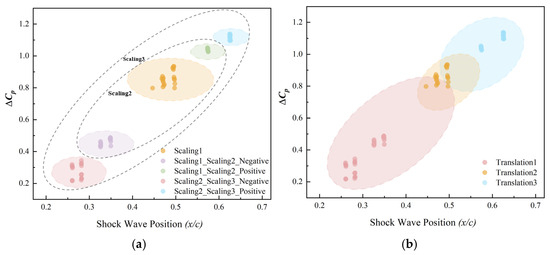 Comparison of shock-wave strength and position in different design spaces. (a) Scaling scheme. (b) Translation scheme.
