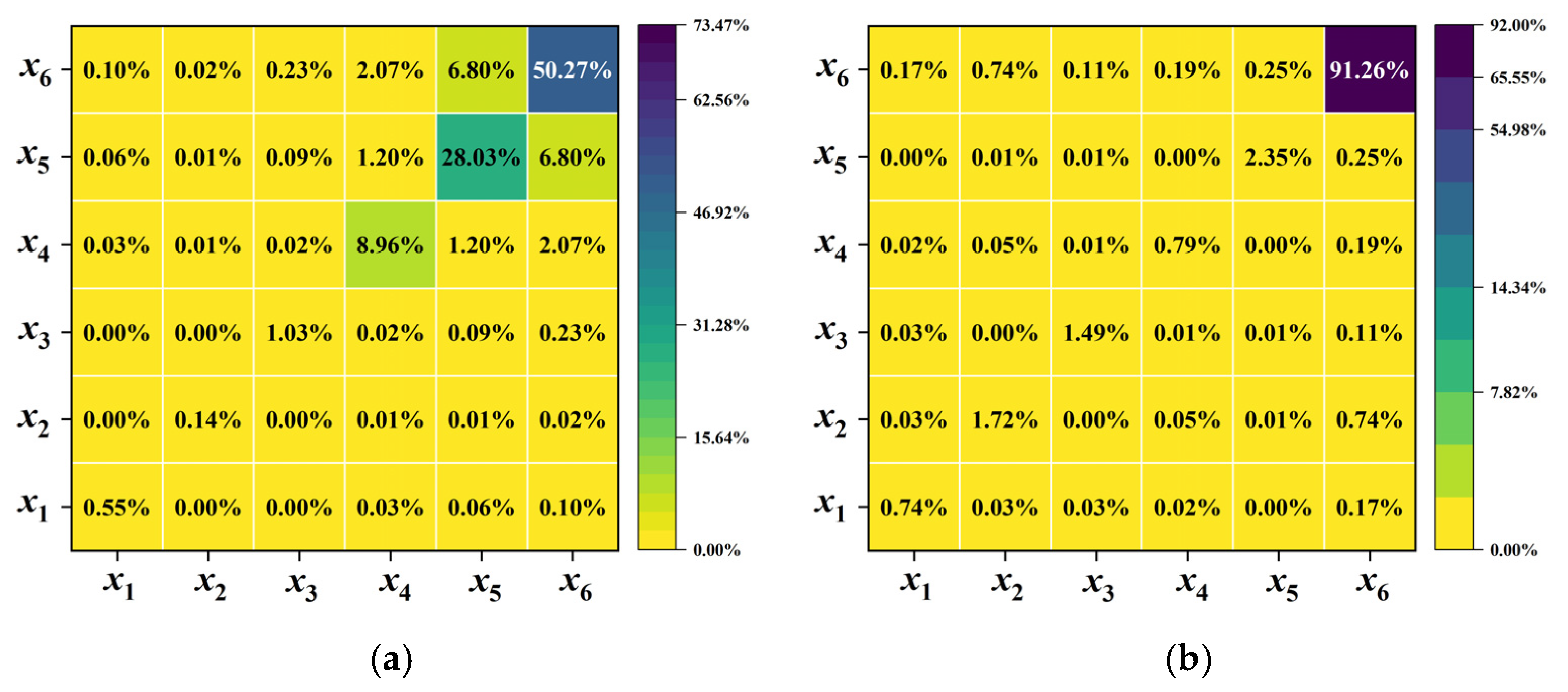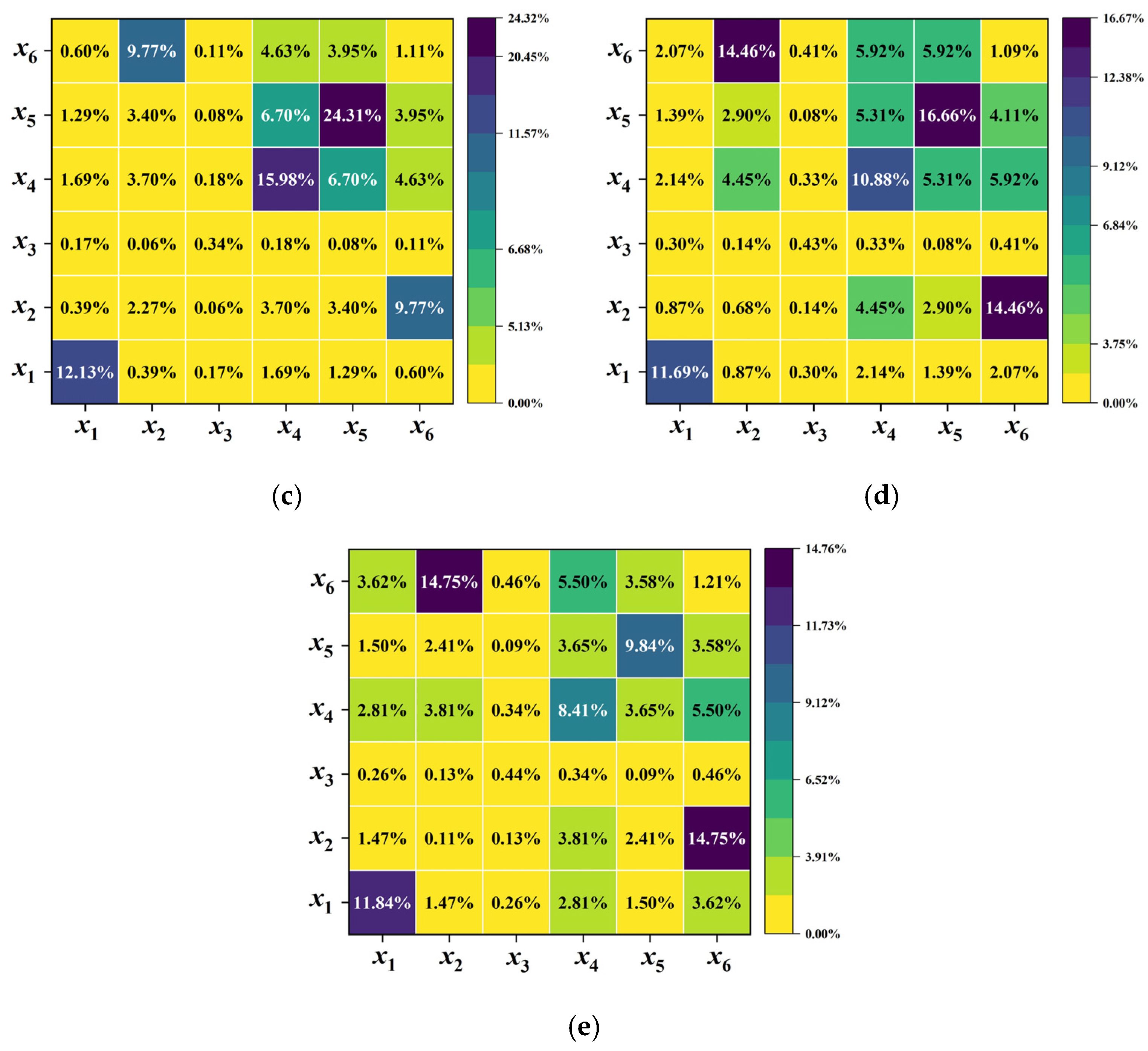where is the first-order sensitivity index, which quantifies the individual contribution of the design variable to the output and is also referred to as the main effect index. A larger value of indicates a greater contribution of to the output. represents the second-order sensitivity index, which reflects the contribution of the interaction between design variables and to the output, also known as the interaction effect indices. is the overall sensitivity index, representing the total contribution of the design variable to the output and is referred to as the total effect index. A smaller value of suggests a lesser contribution of to the output.
