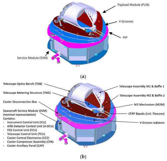 Overview of Ariel spacecraft. (a) Main structural components; (b) details of PLM and SVM elements.