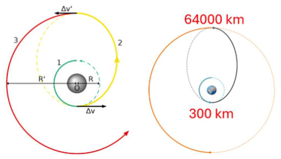To reach the operational orbit around L2, an injection trajectory with a single passage through the Van Allen radiation belts and different Earth orbit altitudes is foreseen [1,2]. This trajectory is approximated by a worst-case scenario of a half orbit lasting 10.5 h, with perigee at 300 km (LEO), apogee at 64,000 km (GEO), and near-zero-degree inclination (refer to Figure 3). Because of the inclination close to zero degrees, for the scope of charging simulations carried out in this work, a geostationary orbit has been considered rather than a geosynchronous one.