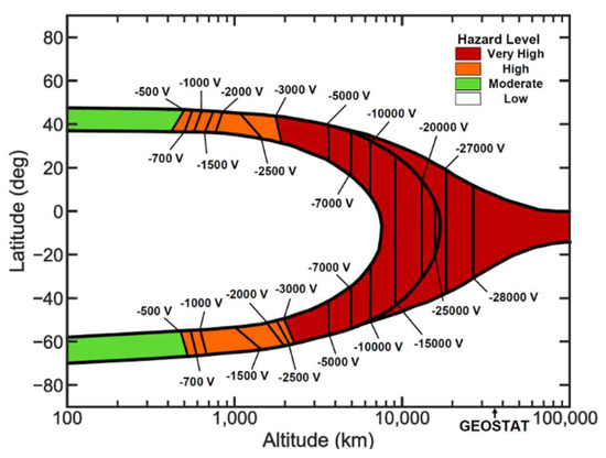Near-Earth regions of concern for surface charging hazards for a shadowed spacecraft. Data derived from the Defense Meteorological Satellite Program (DMSP—800 km altitude) and Freja satellite observations [10].
