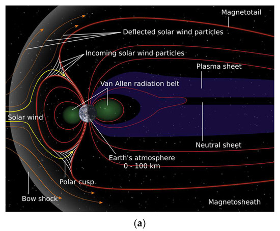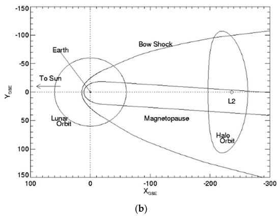 (a) Schematic simplified structure of Earth’s magnetosphere; (b) Earth–Moon system, magnetotail, magnetopause, bow shock, and halo orbit around L2 [15].