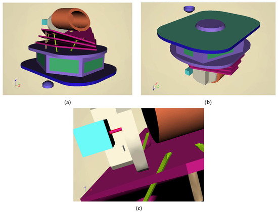 Ariel geometrical model used for SPIS simulations: (a) front view; (b) bottom view; (c) close-up of the FPE-IC connector and FPE strut.