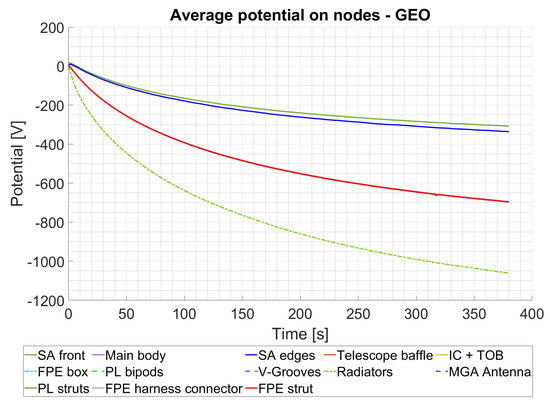 As expected, the GEO orbit is the most concerning. As can be seen from Figure 8 and Figure 9, in this environment, high potential differences are reached both between different surfaces of the satellite and between the surfaces themselves and the ambient plasma (which, as previously mentioned, is taken as the zero potential level). In this environment, therefore, as also mentioned in Figure 5, a high risk of ESD is expected both between different surfaces of the S/C and from the surfaces of the S/C to the surrounding plasma. In Figure 9, the 3D plasma potential map is shown, where its legend reports the plots shown in Figure 8 in a 3D representation. As already mentioned in Section 3, the plasma potential is assumed as a zero-level reference, and the not fully coherent representation in the 3D map is to be attributed to statistical noise caused by the high-energy charged particles model, affecting the simulations’ convergence.