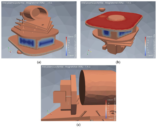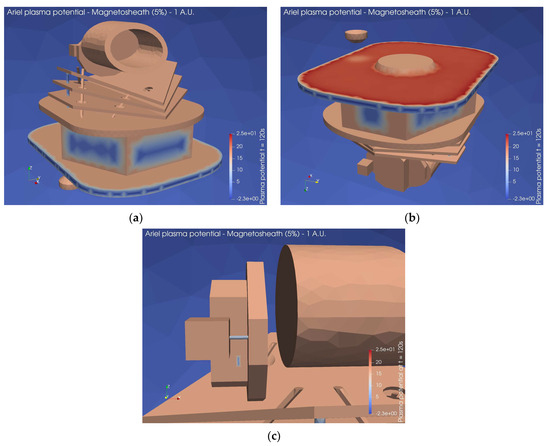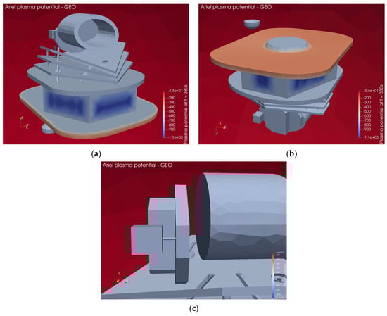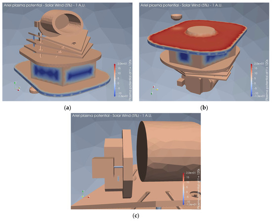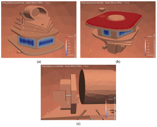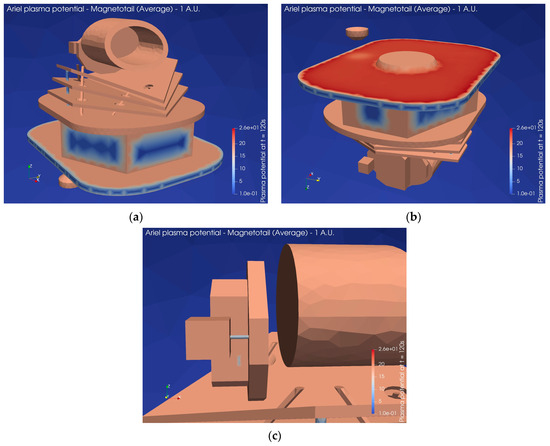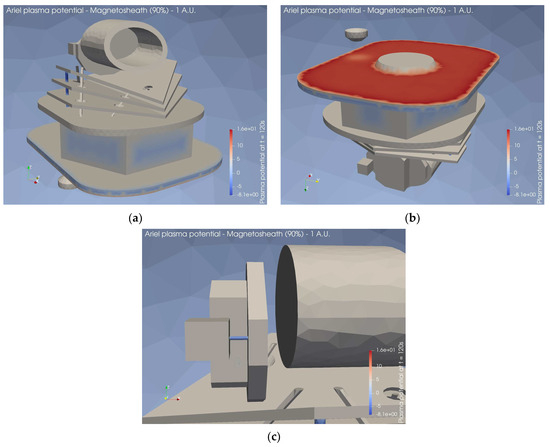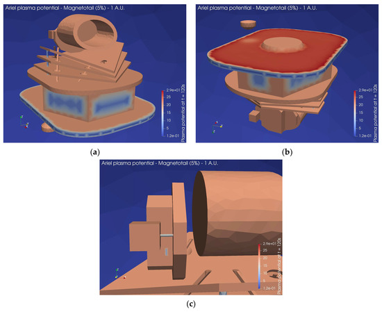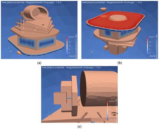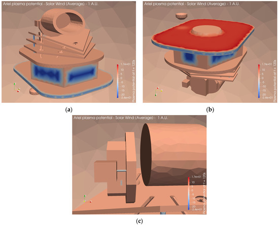 Three-dimensional map of plasma potential—solar wind (1 A.U.)—average conditions: (a) Ariel front view; (b) Ariel bottom view; (c) close-up of the FPE-IC connector and FPE strut.