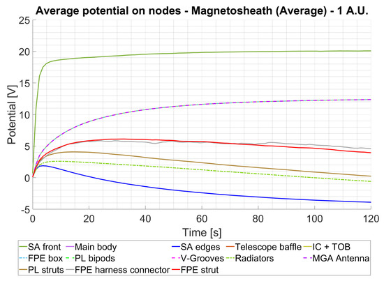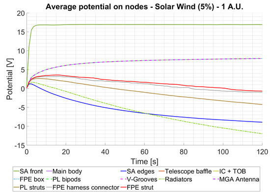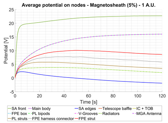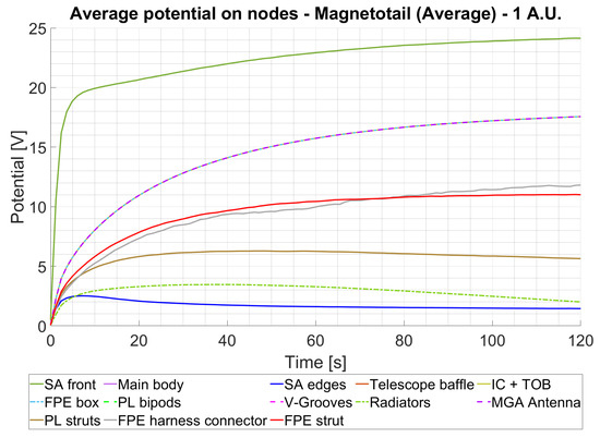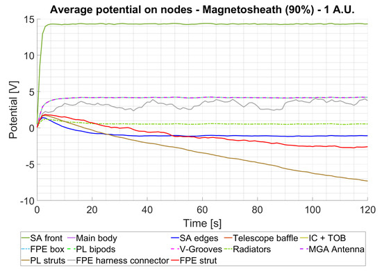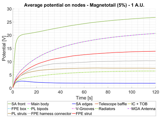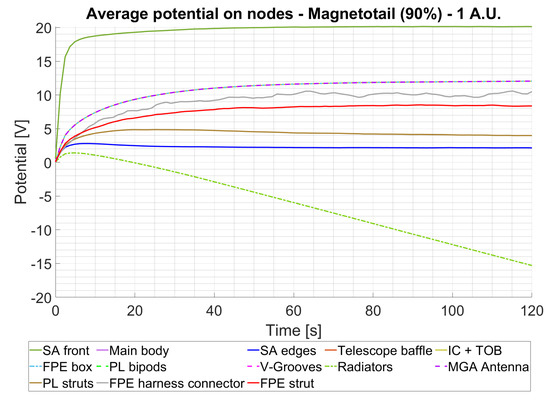 In this environment, the Ariel solar panels charge positively up to about 20 V, while the radiators’ surfaces, covered with non-conductive paint, are charged to a potential of about −16 V, as shown in Figure 26. The environmental plasma potential level, shown in Figure 27, is close to zero as expected. This case presents a higher potential difference between the most positively charged subsystem and the most negatively charged one compared to the other magnetotail cases; however, the obtained potential differences do not pose a significant risk of ESDs according to the ECSS standards [12], either between different surfaces of the S/C or from the S/C surfaces to the surrounding plasma, although longer simulation times would be needed to better understand the radiators’ potential behavior.