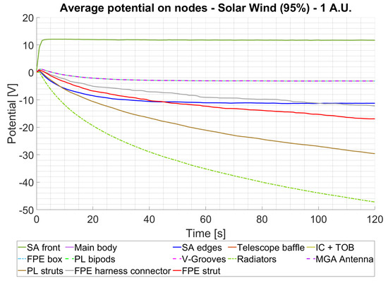 In this environment, the Ariel solar arrays charge positively up to about 17 V due to the photoelectric effect on surfaces directly exposed to the sunlight, as shown in Figure 12 and Figure 13. The radiators’ surfaces, however, covered with non-conductive paint, are slowly charged to a potential of about −12 V. The resulting potential differences do not pose a significant risk of ESDs according to the ECSS standards [12], either between different surfaces of the S/C or from the S/C surfaces to the surrounding plasma. As for the previous paragraphs, the environmental plasma is neutral and shows a zero potential level.