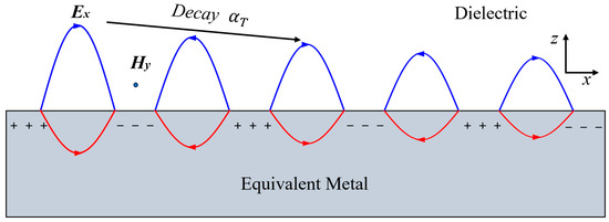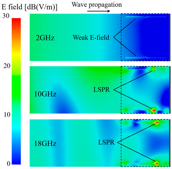 Figure 9, the dashed line indicates the mid-section position of the grille unit. In the low-frequency band, strong electric fields are not observed in the nearby metal wire array. When the frequency exceeds the cutoff frequency, intense electric fields are excited in parts of the metal wire array, resulting in significant surface wave binding and surface plasmon resonance of localized surface plasmons region (LSPR). This process also increases the transmission loss of electromagnetic waves, thereby leading to the enhancement of the absorption of RASs in high-frequency bands, as discussed earlier.
