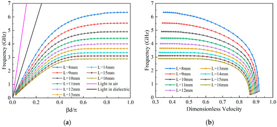 Figure 10b. Away from the cutoff frequency, as the frequency increases, the dimensionless phase velocities of the RAGs of varying unit lengths remain nearly unchanged, hovering around 0.95. This indicates that the RAGs have a higher phase velocity compared to the RASs and limited capability to slow down electromagnetic waves. As the frequency further increases, the dimensionless phase velocities of the RAGs decrease in a manner distinct from the RASs. Eventually, as RAGs approach their respective cutoff frequencies, the dimensionless velocities reduce to around 0.35, aligning with the behaviors observed in the RASs.