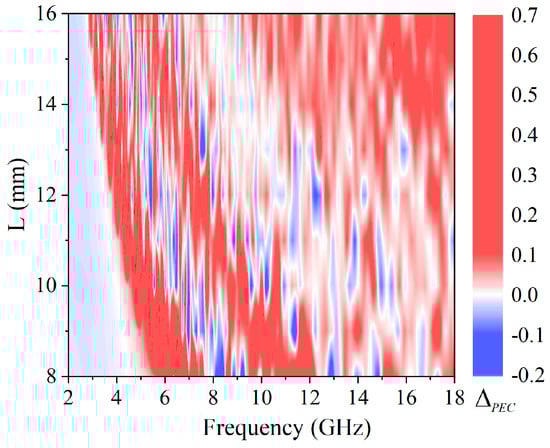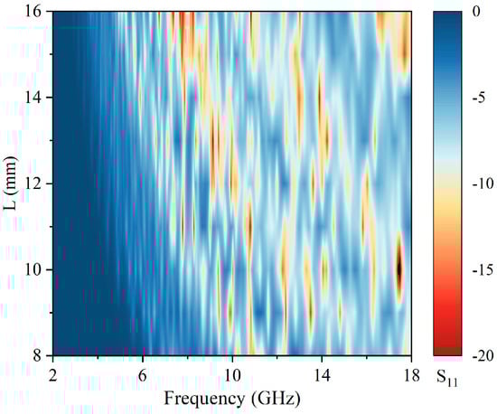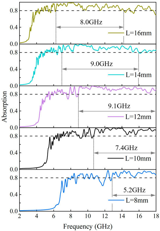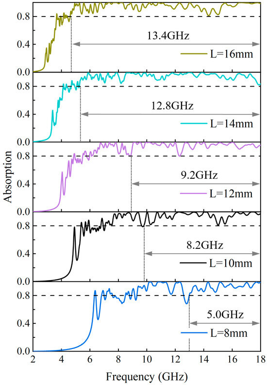 Figure 13. As frequency gradually grows, the absorption rate of different unit lengths illustrates a trend of slow increase away from the cutoff frequency, rapid increase near the cutoff frequency, and broad oscillations beyond the cutoff frequency. Observation from the Figures indicates that with increasing unit length, the absorption rate improves a little in the low-frequency band from 2 to 8 GHz but decreases in the high-frequency band from 8 to 18 GHz. The maximum band of 80% absorption rate, which is 9.1 GHz, is located at a unit length of L = 12 mm. It is calculated that none of the unit lengths of RAGs form a continuous 90% absorption rate band, with the largest absorption rate band ranging from 8.94 GHz to 12.30 GHz at L = 12 mm, with a bandwidth of only 3.36 GHz.