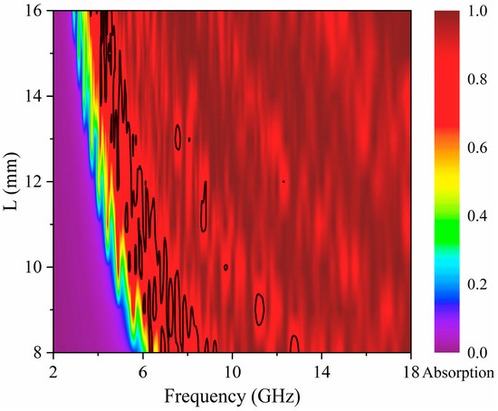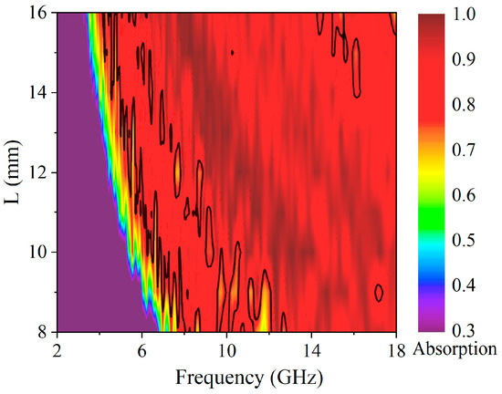 Figure 7 displays a contour of the electromagnetic wave absorption rate of RASs under varying unit lengths L and frequencies. Compared to