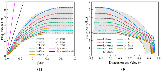 Figure 10a, during the increase in unit length from 8 mm to 16 mm, the dispersion curves of the absorbing grille exhibit an initially quasi-linear rise followed by a plateau stage as they approach the corresponding cutoff frequency. The dispersion curves remain to the right of both the speed of light in air and in the medium throughout this process. It is a phenomenon similar to that observed with RASs equipped with a metallic reflector. The gray shaded area in this figure represents the variation in the dispersion curves for the RASs as the unit length increases from 8 mm to 16 mm; the upper boundary of the shaded area represents the dispersion curve of the RAS at a unit length of 8 mm, while the lower boundary represents the curve at 16 mm. A comparison of the dispersion curves reveals that at the same unit length, L, the dispersion curves of the RAG are similar to those of the RAS, and the removal of the metallic reflector has almost no impact on the cutoff frequency as the normalized phase delay increases. Away from the cutoff frequency, there are slight differences between the dispersion curves of the RAG and the RAS.