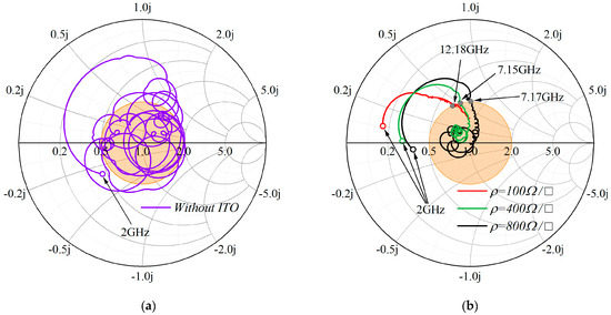 , the frequency starts even closer to the matching circle and moves towards the center, entering the matching circle beyond 7.15 GHz and 7.17 GHz, respectively, and getting closer to the Smith chart’s center point, indicating improved impedance matching characteristics. Therefore, the RAG-Rs with added ITO films exhibit better impedance-matching properties, facilitating electromagnetic wave transmission into the grilles and reducing reflected energy.