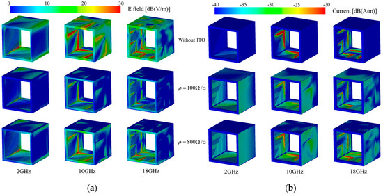 Figure 18b, it is also shown that the RAG without ITO resistive films generates smaller induced currents at lower frequencies. As the frequency increases, intense induced currents are generated near certain dimensions of the metallic wire arrays. Upon the addition of ITO resistive films, noticeable induced currents are produced on the films of RAG-Rs. At lower frequencies, the metallic wire arrays and ITO resistive films also excite more uniform induced currents.
