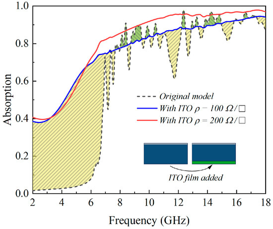 . The original model without ITO resistive films only presents an average absorption rate of 0.61, with an absorption bandwidth of merely 5.2 GHz. When ITO resistive films are employed, both the average absorption and the bandwidth initially increase with increasing resistance. The maximum values are reached within a sheet resistance of