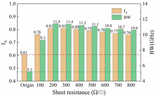 Figure 22 displays the integrated average absorption rates and the 90% absorption bandwidth for various unit lengths and sheet resistances. The results reveal that the sheet resistance of