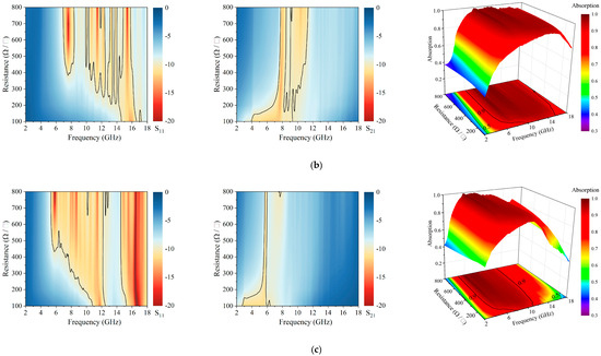 leads to lower absorption bandwidth and average absorption rates across different lengths. Additionally, the integrated average absorption rates are notably low for a unit length of 8 mm. High absorption rates are predominantly observed within the medium unit lengths ranging from 11 mm to 14 mm and medium sheet resistances from 200 to 600