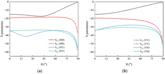 Figure 24 reveals the scattering parameters variation of horizontal and vertical polarization at unit length L = 12 mm. The trends of scattering parameters at other design parameters are similar. For horizontal polarization, the co-polarized