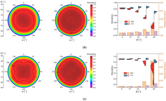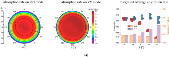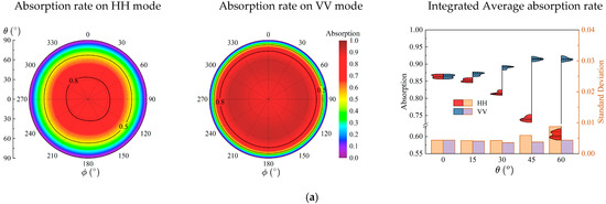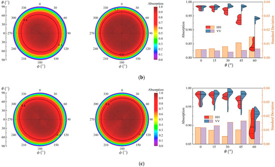 , the distributions under both HH and VV polarizations are quite similar, exhibiting a bimodal distribution with a relatively concentrated range of variation and nearly identical standard deviations. From 0° to 60°, the high-rate distribution region for HH gradually decreases, with the mean absorption rate dropping from 86.41% to 60.50%, whereas for VV, the high-rate distribution region slightly elevates, with the mean absorption rate increasing from 86.42% to 91.48%, and its distribution remains more concentrated compared to HH. With increasing incident angles, the standard deviation for HH gradually increases, indicating greater variability in absorption capability with angle, whereas the standard deviation for VV remains more stable.