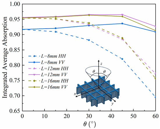 is notably low. At larger angles, the average absorption rates under HH polarization for different unit lengths deteriorate to varying extents, all falling below 0.8 at 60°. As the unit length increases, the angular absorption rate of the RAG-R initially rises, followed by a slight decline. Consequently, smaller unit lengths are harmful to enhancing absorption performance, while choosing a moderate or larger unit length generally results in better absorption capabilities, which leads to the same conclusion as above.