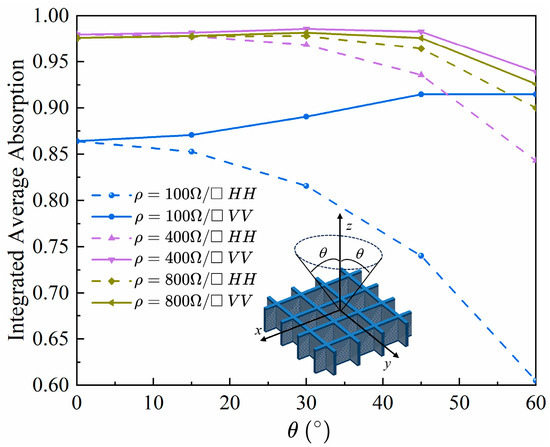 plane is defined as the electric field direction under vertical polarization. In this study, the angular distribution of absorption characteristics as a function of the unit length is simulated when the electromagnetic wave frequency is set to 10 GHz, and the sheet resistance is fixed at