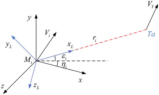 The relative motion model of the missile and the target under the 3D inertial coordinate system is shown in Figure 1. denotes the inertial reference frame and is the LOS frame. and denote the i-th missile and the maneuvering target, respectively. is the distance between the i-th missile and the maneuvering target along the LOS direction. and denote the LOS elevation and azimuth angles, respectively.