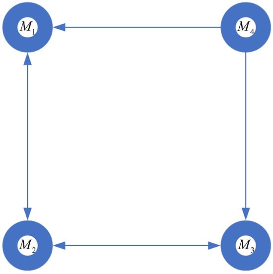 In this section, simulations demonstrate the effectiveness of the proposed predefined-time cooperative guidance law in 3D space. Considering a group of four missiles attacking a maneuvering target, the communication topology is shown in Figure 2. In addition, Figure 3 shows the communication topology when a communication failure occurs for the fourth missile. The adjacency matrices of Graph 1 and Graph 2 are shown in Equations (60) and (61), respectively. The initial conditions of the missiles and the desired impact angles are shown in Table 1. The initial position of the target is (3160, 3180, 3160) m and the three acceleration components of the target are all 20 . In addition, the control inputs are constrained to be , , considering the limited control input capability of the missile.