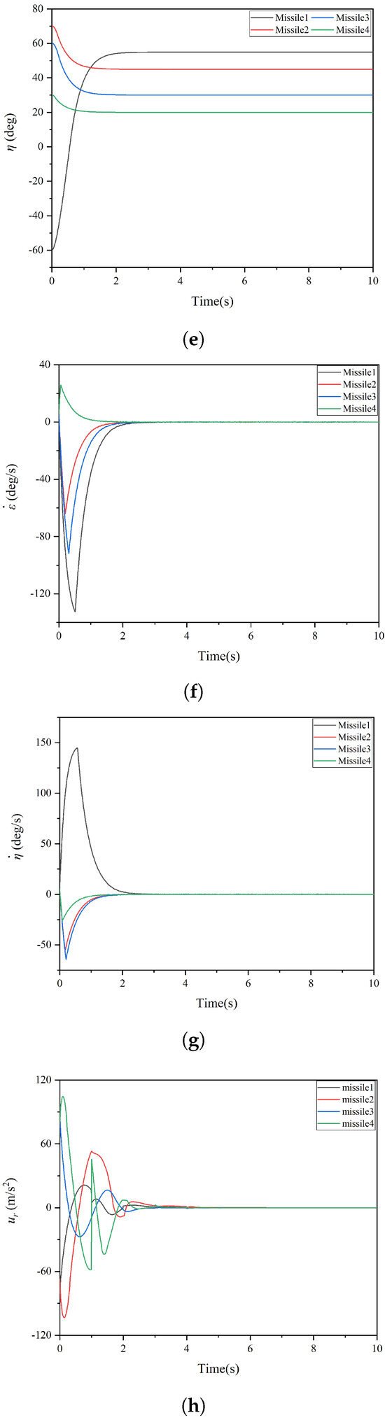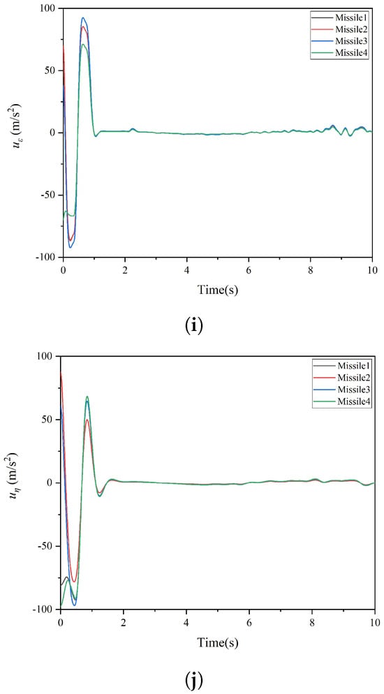 The communication topology shown in Figure 3 is compared to Figure 2, where the forth missile fails to receive information from neighbors, i.e., the first and third missiles. When 2 s 2.2 s, the system is in the process of convergence; when 6.5 s 6.8 s, the system is converged. In these two stages, the communication topology is switched to Figure 3. The simulation results are shown in Figure 8. Since there is no information interaction perpendicular to the LOS direction, only the control input along the LOS direction is listed. Figure 8 shows that the consistency of the multi-missile system can still be achieved regardless of whether topological transformations occur during or after convergence. A closer look reveals that when the communication topology is switched from Graph 1 to Graph 2, the forth missile is unable to receive information from the first and third missiles, i.e., . Therefore, according to the guidance law (52), will change, which is consistent with the simulation results.