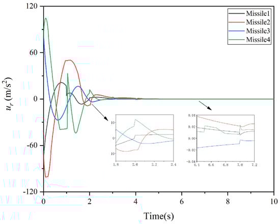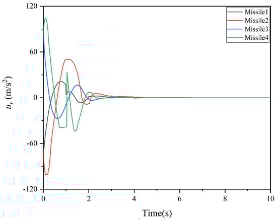 Firstly, the guidance law (46) along the LOS direction with the event-triggered threshold satisfied (49) and the guidance law (17) along the LOS direction without considering the event-triggered mechanism are compared, as shown in Figure 5. From the figure, it can be seen that, after the introduction of the event-triggered mechanism, the acceleration components of the four missiles along the LOS direction are reduced to different degrees, indicating that the introduction of the event-triggered mechanism can reduce the control input along the LOS direction.