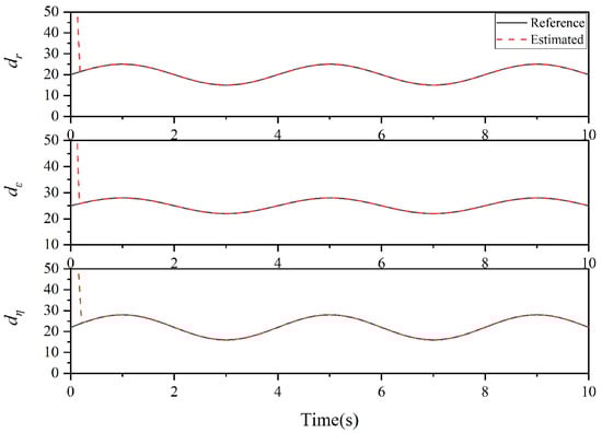 In this section, external disturbances and uncertainties are added to the 3D engagement kinematic model, and the acceleration terms of the target are considered as disturbances. The disturbances are then estimated using PTESO, as shown in Figure 7. The disturbances in the three components of the LOS system are , , and , respectively. Figure 7 shows that the disturbances can be accurately estimated using PTESO, thus verifying the effectiveness of PTESO in the proposed guidance law.