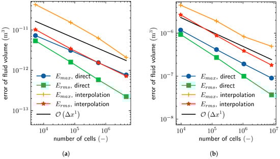 Figure 5 shows the errors and over different mesh sizes when calculating the fluid volume for each example geometry. In every case, the order of the method is higher than one, so both the direct method using the Heaviside function and the interpolation method converge. The direct method produces smaller errors than the interpolation method, both in terms of maximum errors and average errors . Further, the direct method is of slightly higher order as well, so it should be the preferred method for calculating the fluid volume. When evaluating the maximum errors in the telescope geometry (Figure 5c), an increase in errors over the first mesh refinement is seen. This can be attributed to the very coarse mesh setting, where the cell size is the same as the width of the initial fluid volume (5 mm).